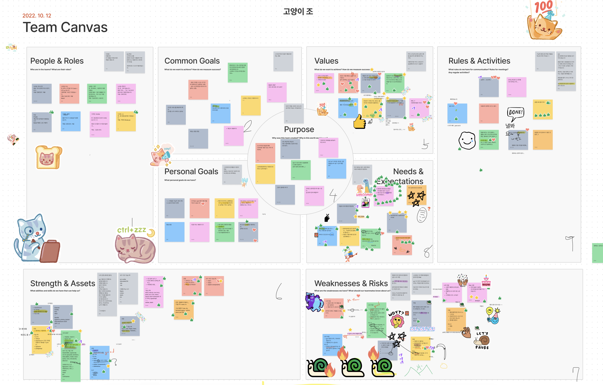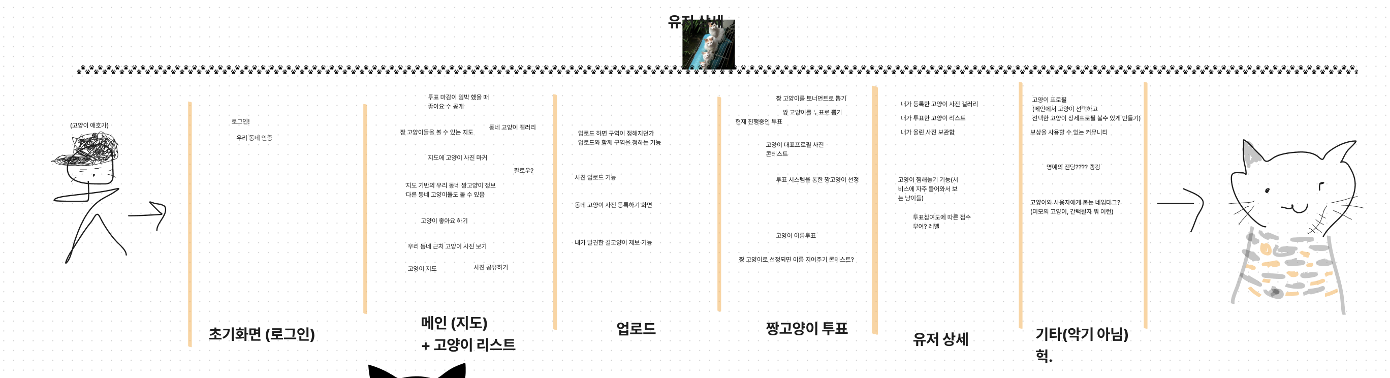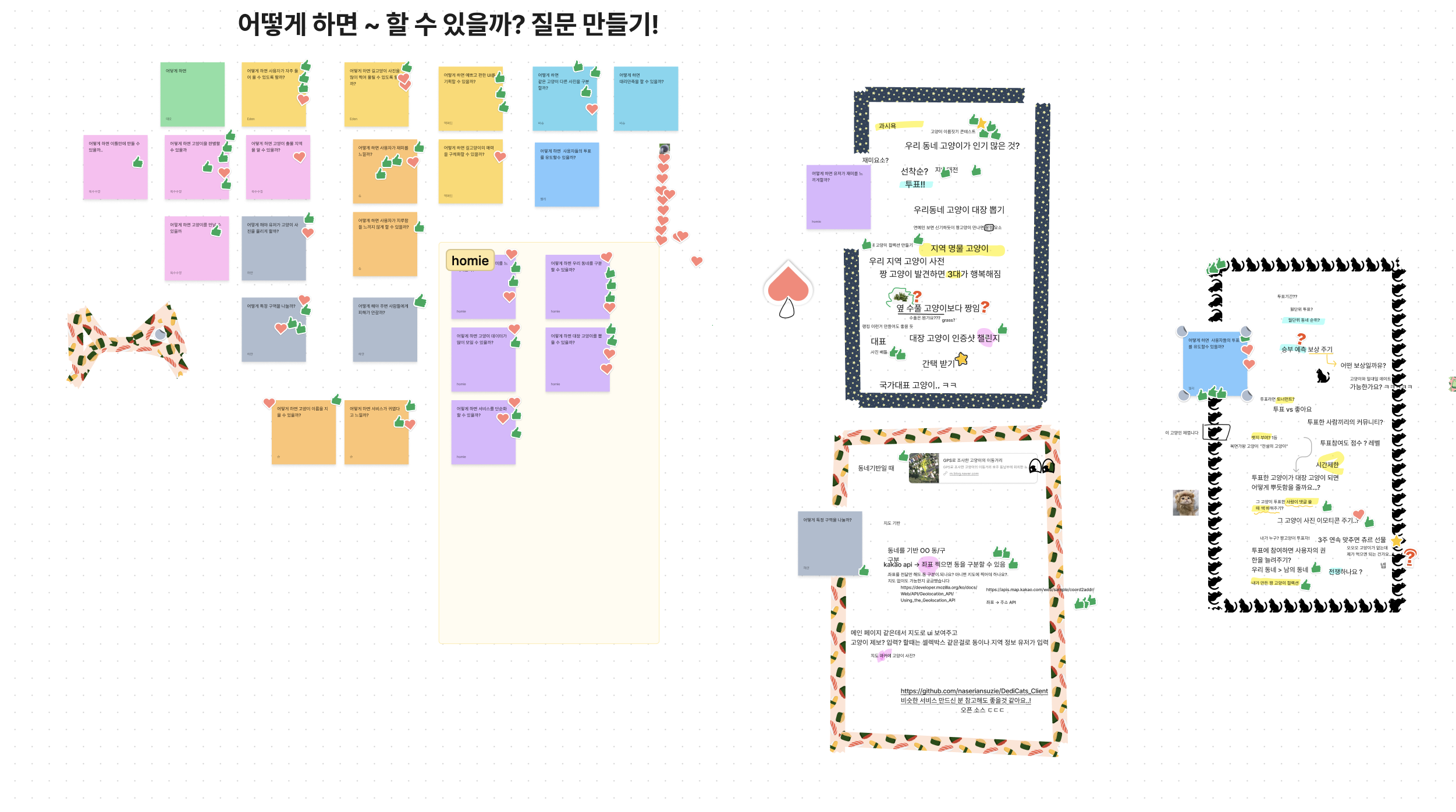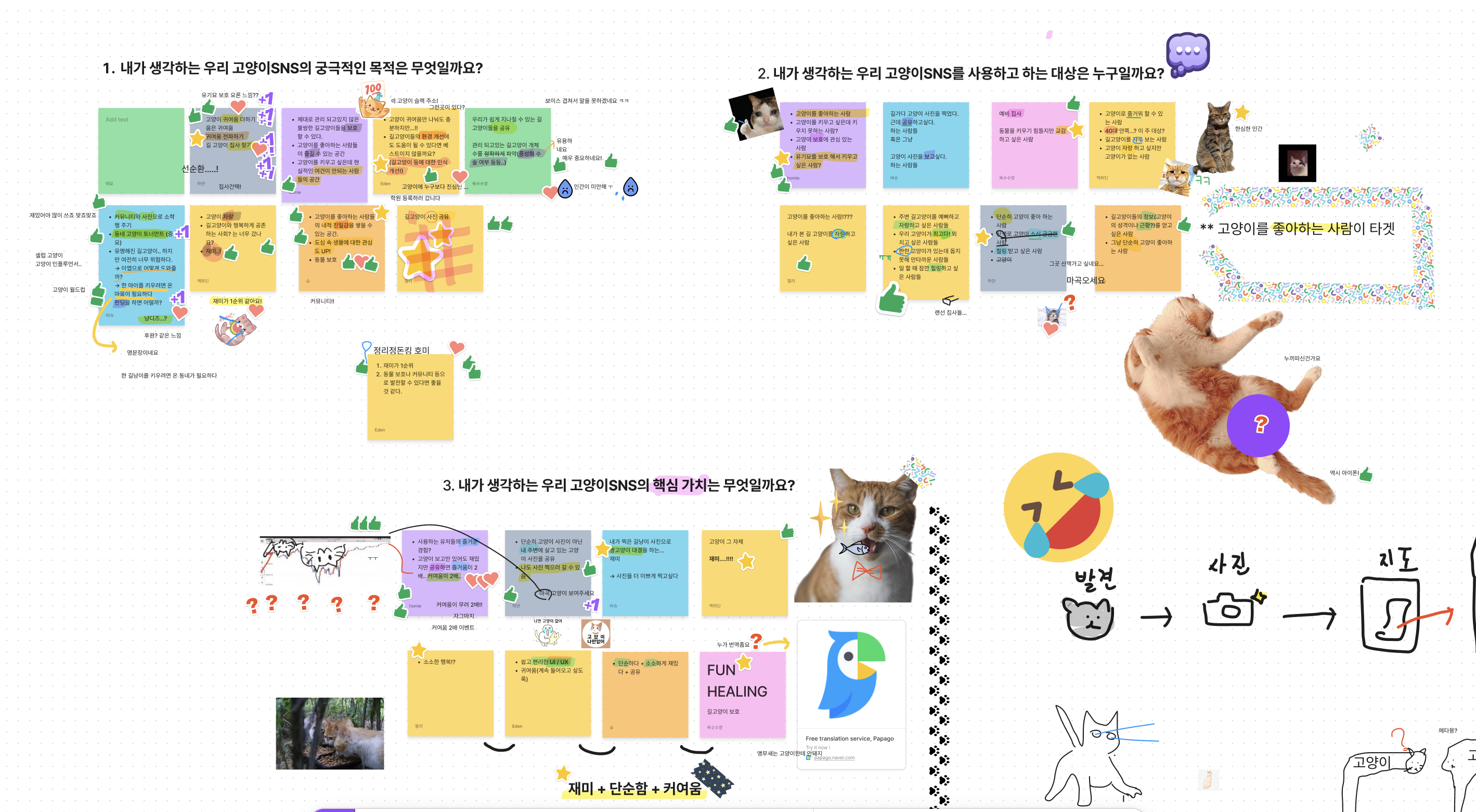 각자의 생각을 적고 공유해보니 우리가 생각하는 서비스가 추구하는 가치가 "재미" 와 "귀여움" 에 집중되면 좋겠다는 의견이 모였고 나아가 길 고양이들의 환경 개선에도 도움이 되고 싶다는 의견이 모였다. 우리가 생각하는 서비스의 방향에 대해서 나눴으니 이제는 구체적인 방안들을 고민해 봐야할 시간.